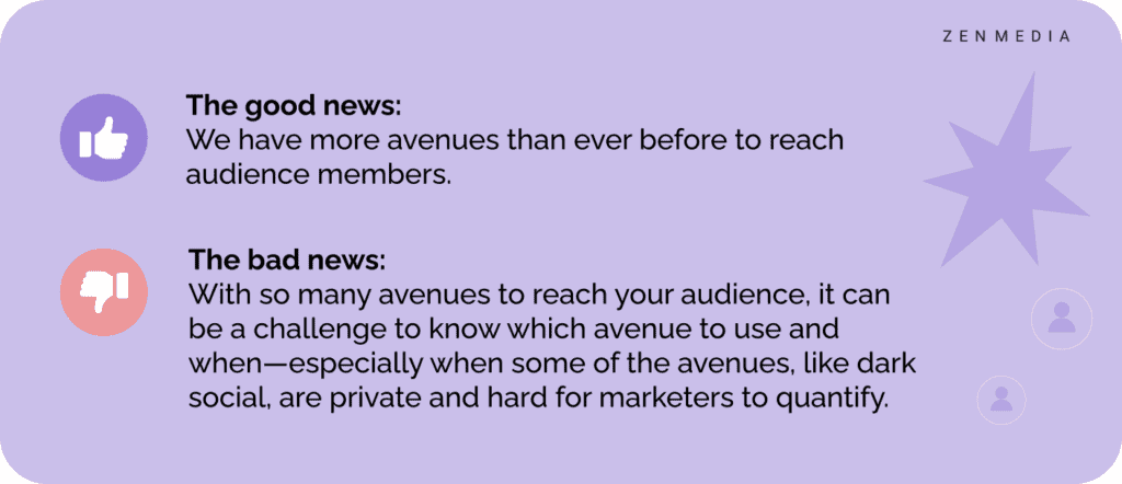 The bad news: With so many avenues to reach your audience, it can be a challenge to know which avenue to use and when—especially when some of the avenues, like dark social, are private and hard for marketers to quantify.