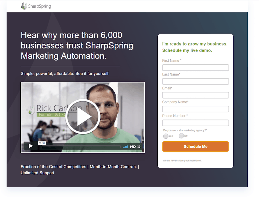It’s got a clear call to action, a simple form that’s easy to fill out, video prospects can watch if they want to, plus the three most important elements of their value proposition listed at the bottom.