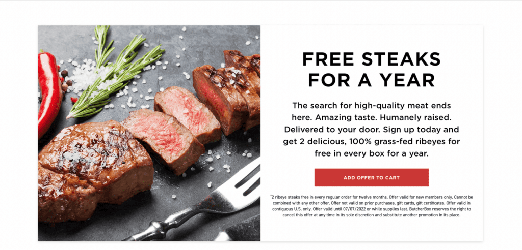 Too often, businesses stuff multiple CTAs into their communications. But having more than one CTA on a landing page will only distract and confuse users. Take Butcher Box, for example. The high-quality meat company makes its CTA clear: sign up for our subscription box and receive two free steaks per box. The landing page repeats the CTA just enough to drive the point home and give users more than one place to convert.