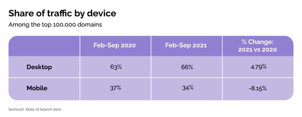 “Mobile first!” Marketers have been shouting that message from the rooftops for years, but does it still hold true? Apparently not. Data shows an 8% year-over-year decrease in mobile traffic. This directly contradicts the “mobile-first” message marketers have been touting for years. On top of that, desktop traffic has been on the rise since 2020. So what does this mean for you? Should you abandon your mobile-first approach? Not necessarily. This metric shows us that it’s important to invest in both sides of your digital marketing strategy—mobile and desktop—to ensure that your users’ experiences are positive across the board. With so many leaders promoting the mobile-first method, some brands let their desktop experience lapse. It’s time to revamp.